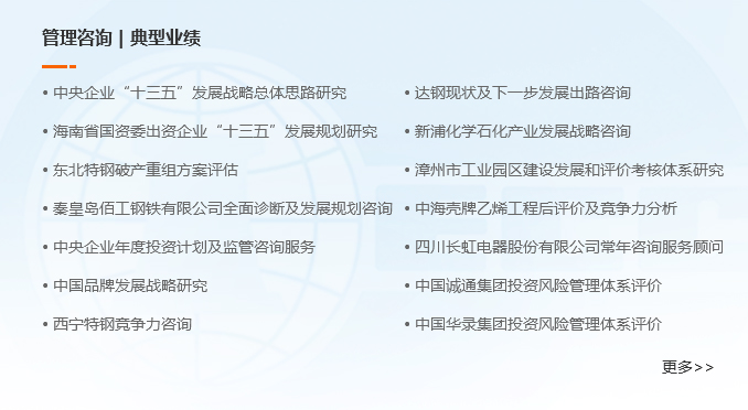 中咨公司專(zhuān)家具有豐富理論知識(shí)和實(shí)踐經(jīng)驗(yàn),通過(guò)進(jìn)行實(shí)地調(diào)查研究,應(yīng)用科學(xué)方法,提出企業(yè)發(fā)展戰(zhàn)略和經(jīng)營(yíng)管理改進(jìn)方案。主要為企業(yè)提供企業(yè)發(fā)展戰(zhàn)略、企業(yè)信息化、財(cái)務(wù)管理、人力資源管理、企業(yè)診斷等服務(wù),為企業(yè)發(fā)展保駕護(hù)航。